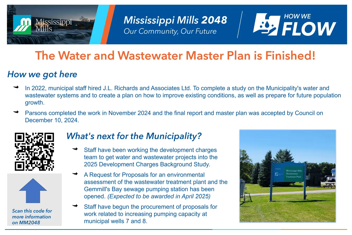 The Mississippi Mills Water and Wastewater Master Plan updates the 2018 Master Plan and is part of the MM2048 coordinated strategic planning approach.