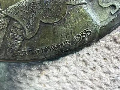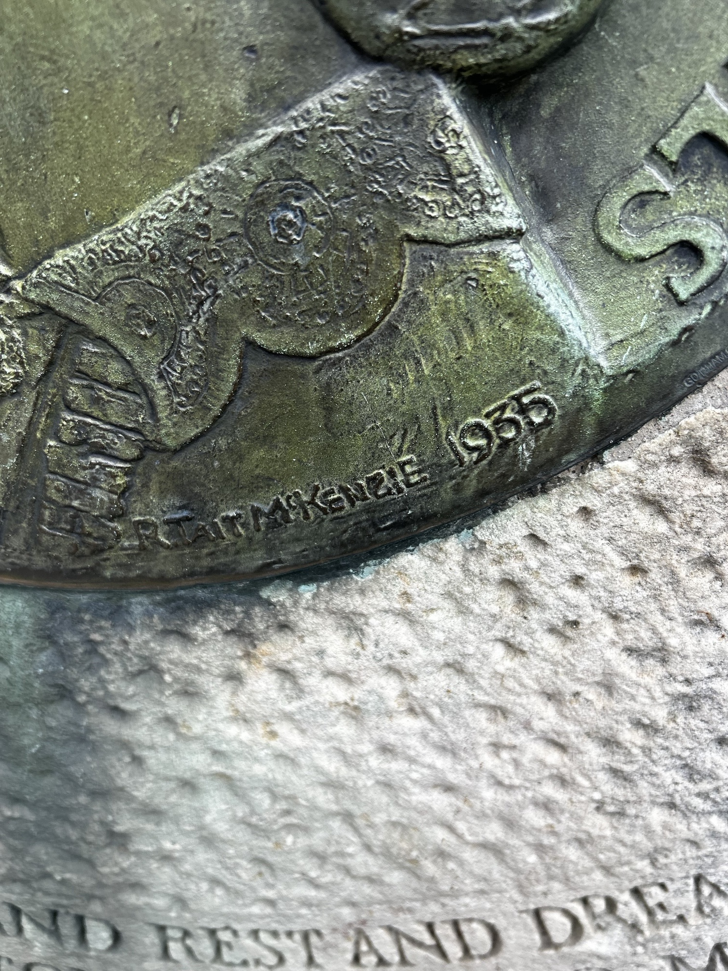 If you look closely, you will also find that the bronze medallion is signed by R. Tait McKenzie, the famed local sculptor.