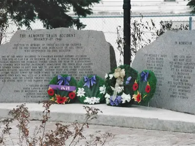 In 1942, a Canadian military troop train operated by Canadian Pacific struck the rear of a local C.P. passenger train killing thirty-nine people and injuring over 200. A memorial to the victims and survivors stands at the corner of Bridge Street and Mill Street. Plaques are marked with the names of the 39 deceased.