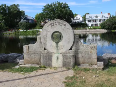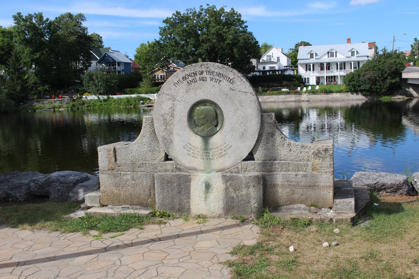 A stone bench, with an old stone from a grist mill incorporated into its construction, sits along the bank of the Mississippi River where the Almonte Old Town Hall is located. On the back of this bench is a bronze medallion inscribed with the names William McKenzie and Catherine Shields. The inscription reads: