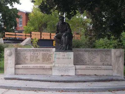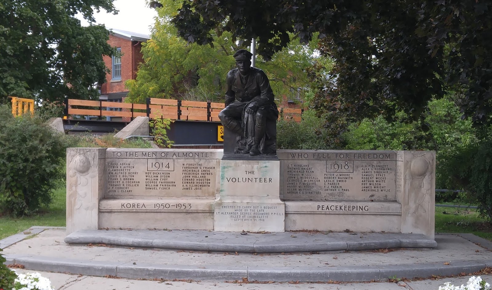 The title of this memorial is "The Volunteer". Sculpted by R. Tait McKenzie and dedicated September 11, 1923, it was constructed in memory of the men of Almonte who fell for freedom in the First and Second World Wars and the Korean War. The memorial was Requested by Alexander Rosamond in a letter he wrote to his family in July 1916. He was lieutenant in the Princess Patricia Canadian Light Infantry who had taken over leadership of the Rosamond Woolen Company from Bennett Rosamond. He noted that, if he did not return, he hoped a memorial could be build in a central place in Almonte, "to the men of Almonte who fell for freedom."