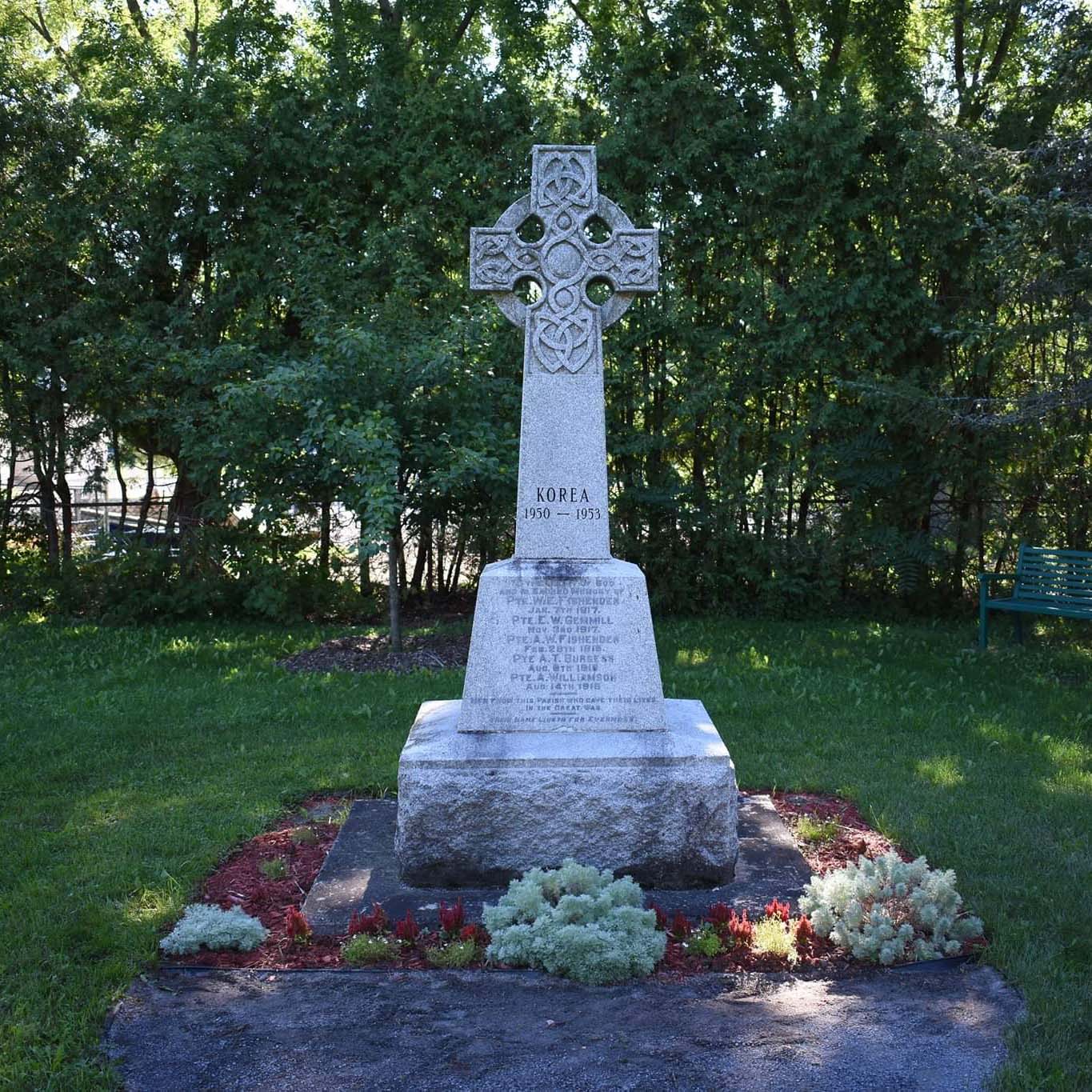 The Celtic Cross of the memorial symbolizes the Irish heritage of the early settlers to this area. The names of the brave men who made the supreme sacrifice in the World Wars are listed on the cenotaph.